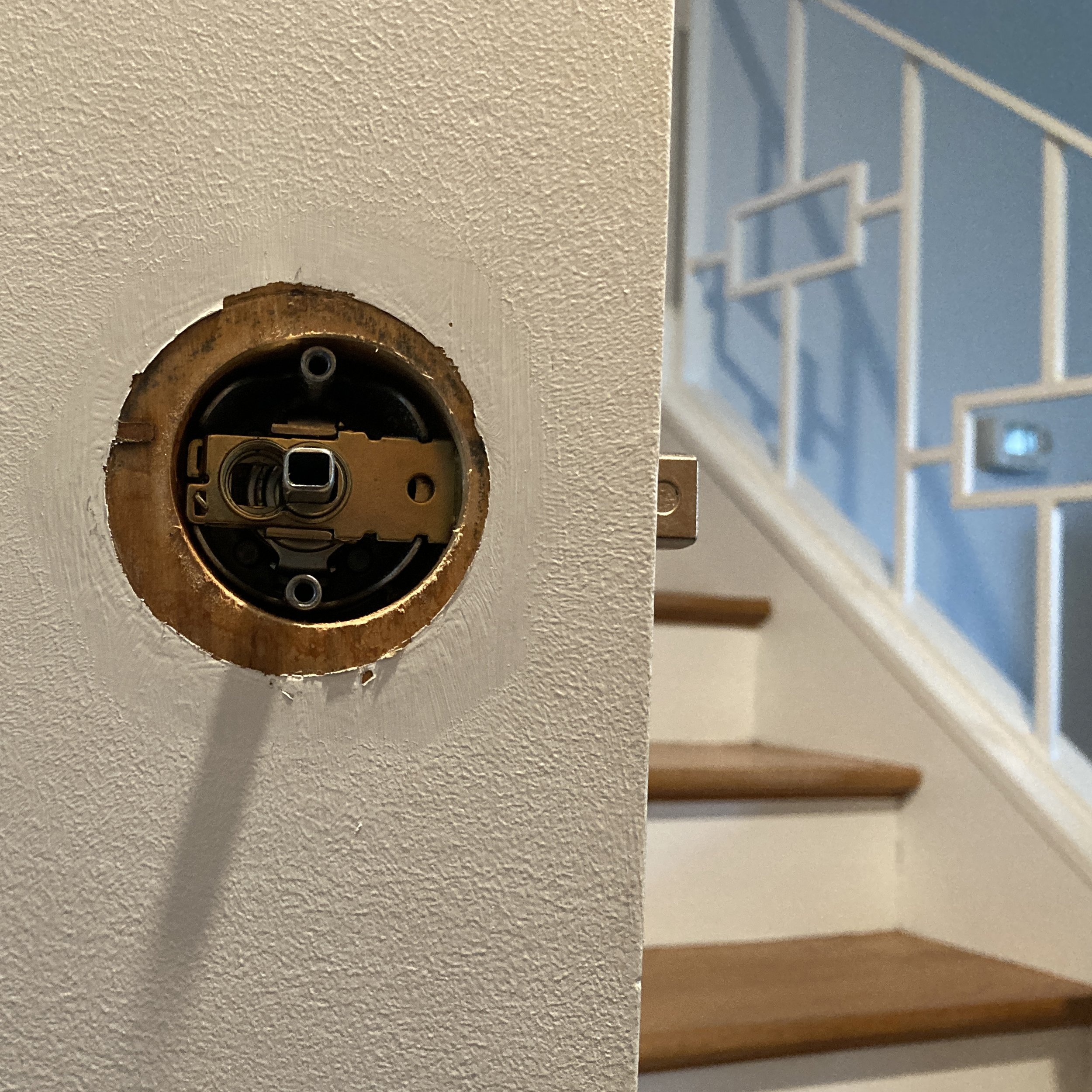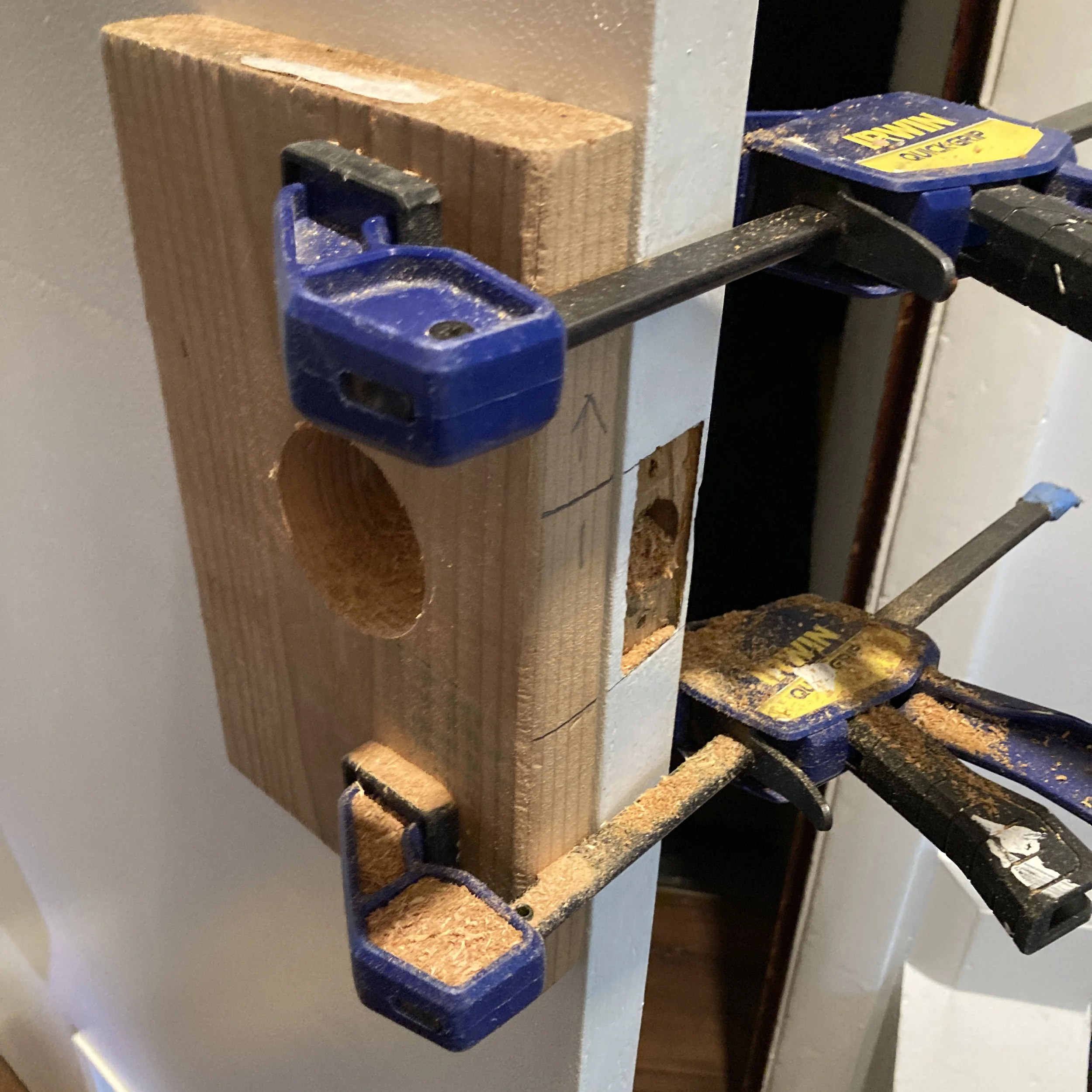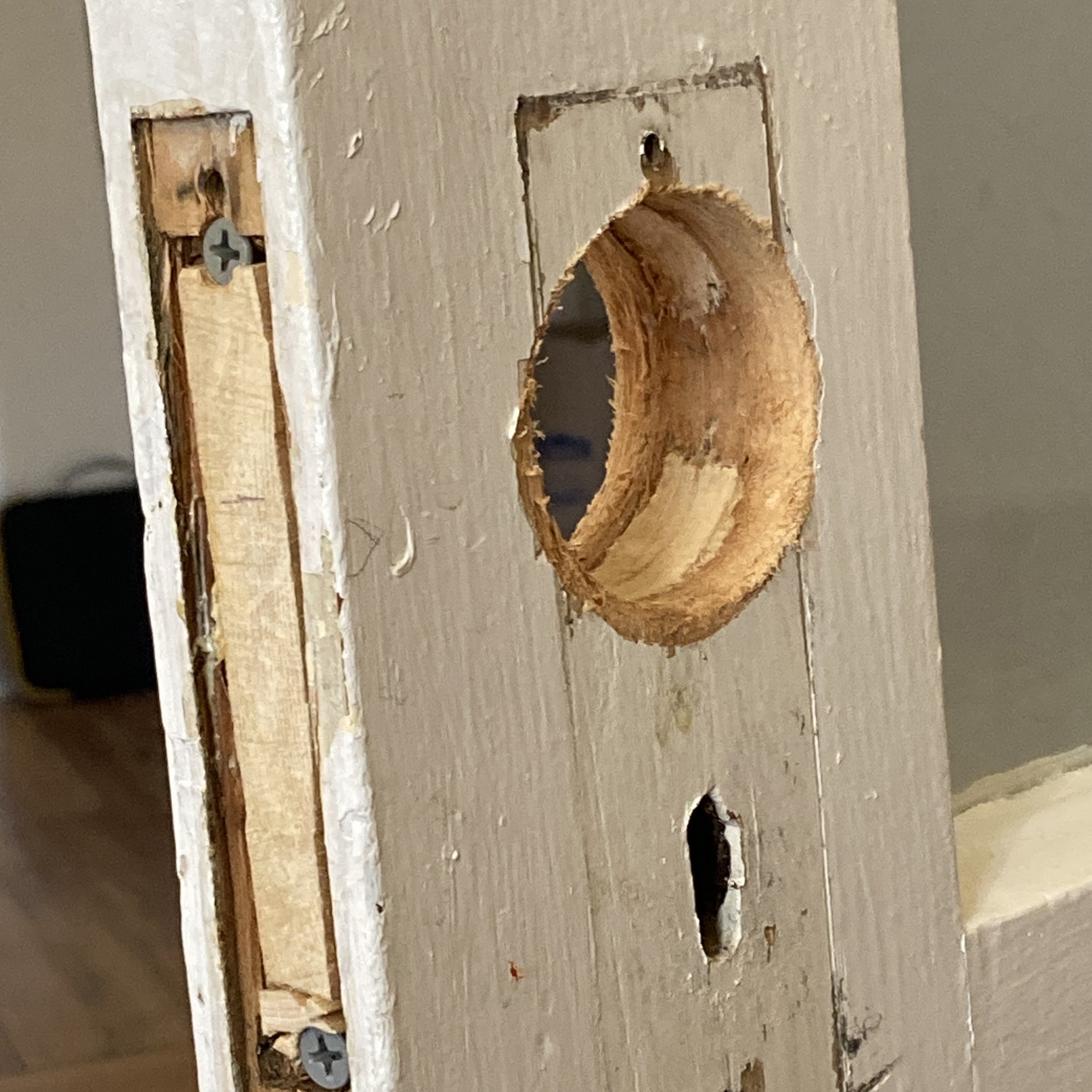Dimensions are standardized now, but as recently as the 1950s there was still considerable variation. The hole for the door knob below is 1/8th of an inch too small for modern hardware, so I used a hole saw and jig bring it up to date.